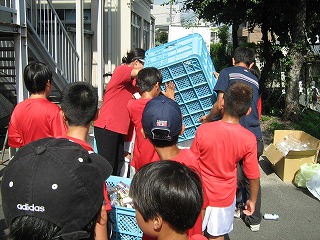 アルミ缶・ペットボトルのリサイクル活動を行っていることを地域の方々にも広く知ってもらっていることで,夏休み中もたくさん学校に運んできてもらっています。 カゴに集められたアルミ缶・ペットボトルを袋につめ直す作業を先日はアメリカンフットボール部の子ども達が,そしてこの日はサッカー部の子ども達が手伝ってくれました。 みんなで協力しながらこれからもリサイクル活動を頑張っていきます。