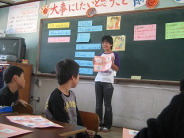 10月20日に「小学校における英語活動等国際理解活動推進事業拠点校」の授業公開を行いました。今回は5年生で英語ノートを使い「自己紹介をしよう」という単元で行いました。 それぞれが自分の作ったカードを友達に紹介しあうコミュニケーション活動を中心に行いました。 子ども達はお互いの好きなものを,英語で楽しそうに紹介していました。