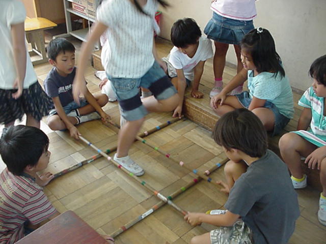 3拍子のりズムを楽しく覚えるために、バンブーダンスをしています。
