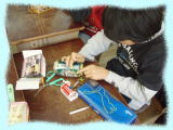 豆電球と導線をうまくつないで乾電池とつけます。子どもたちは「導線と乾電池を一緒にしっかり押さえておかないと,明かりがつかないんや。」「ソケットから豆電球を取ると明かりが消えてしまう。」などたくさんの発見をしました。