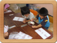 夏休みの間に,毎日お世話をしてきたあさがおを使って,和紙を染めました。淡い色に染まった和紙を見て,「きれーい。」という声が聞こえてきます。あさがおからできた色水はまるでぶどうジュースのようでした。がんばって育てたね。取れた種は,来年入学してくる一年生へのプレゼントにしようね。
