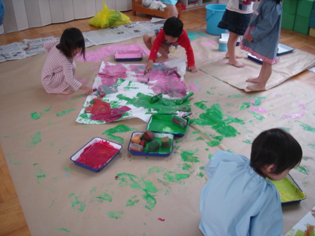 初めはおそるおそる絵の具に触れて遊ぶ子どもも、時間がたつにつれ手や足に 絵の具を塗って紙にペ タペタと型をつけて、はしゃぐ姿やローラーでごろごろと 色を塗ったりする姿が見られました。