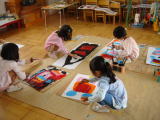 鉾の絵をかきました。「月鉾好きやし、かこう」「これエンヤラヤーって言う人」「屋根に乗ってる人がいるんやで」「岩戸山にあがってるとこ」「高いのかきたいし、紙つなげて」などいろいろ言いながら楽しくかきました。壁に貼ると、「これ僕の絵」と満足げな子どもたちでした。