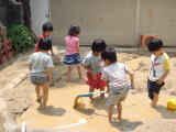 今日はゆり組の研究保育でした。こどもたちは午前中から砂場で酒のケースを高く積み上げ、樋をつなげて水を流し遊んでいました。午後からはみんな裸足になり、砂場の「プールをつくる!」と張り切り、水を何度も運び、穴を深くほり、存分に楽しんでいました。