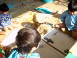 年長児は『かにむかし』のお話で遊んでいます。今日は友達と一緒に,大きなダンボールに柿の木を描きま した。かにが育てたおいしい柿の実がいっぱいついています。