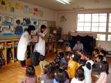 たんぽぽ組(3歳児)は歯の話・秋の食品について,ばら組(4歳児)は歯の磨き方・風邪予防とマナー,ゆり組(5歳児)は歯並び歯磨き・タバコと肺の話でした。途中,パペット人形のけんちゃn,こうちゃんの歌を踊りも交えてみんなで歌いました。門川教育長をはじめ,体育健康教育室,学校指導課,京都市立幼稚園長会よりたくさんのお客様がいらっしゃいました。