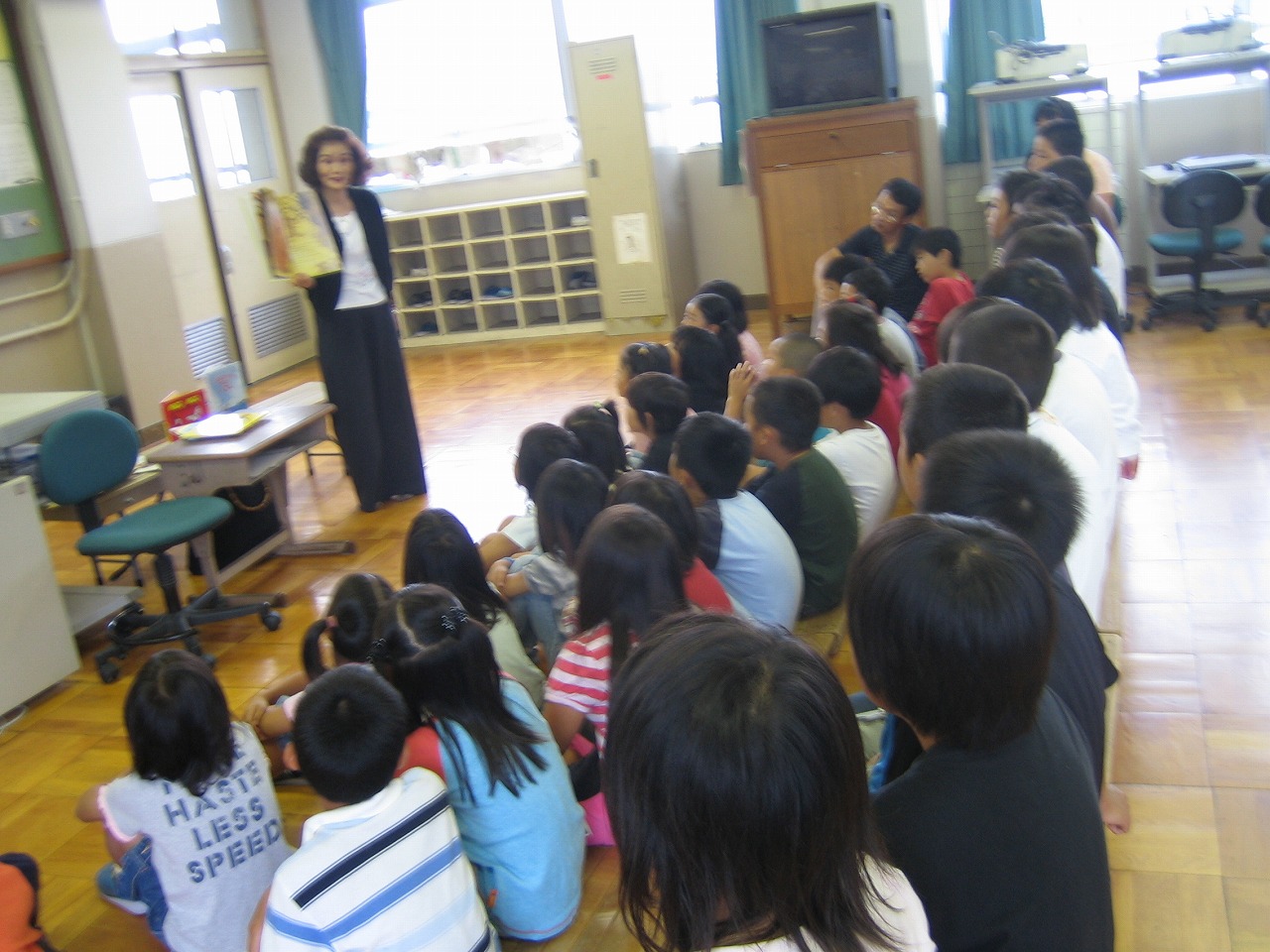 京都新聞社より読み聞かせキャラバン隊の方に来ていただき,読み聞かせをしていただきました。どんどん絵本の世界に吸い込まれ,本の楽しさを今まで以上に知りました。これから図工で楽しく,お話を絵にしていきます。