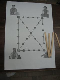 ユンノリって何? ユンノリは、約1500年前から楽しまれてきた日本の「すごろく」に似ている遊びです。お正月など人が集まった時に、遊ぶと簡単で楽しく遊べます。コマをスタートからゴールまで動かして進むところが、日本のすごろくとよく似ているところです。違うところは、「ユンノリ」はサイコロのかわりに「ユッ」というぼうを使って遊ぶところです。四つのコマを一度に進めるか、一つ一つ進めるかそれは作戦しだいです。人数は、二人以上なら何人でも遊べます。 |