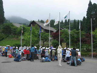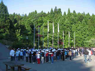 ぐっすり寝た子や寝不足気味?の子がいる中で『朝の集い』が行なわれました。朝の気温はなんと9℃。長袖を着ていても寒がっている子が沢山いました。