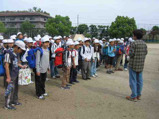 「朝の集い」にて 気温は9℃。あまりに寒く,上着をほしがる子が沢山いました。 |