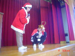サンタとトナカイの臨時吉吉コンビです。 (今月は教務主任の吉山が,研修で不在の ため,非常勤の吉村が担当しました。) |