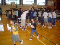 1年生へプレゼントです。全員で 協力して作ったペン立てです。 2年生が渡しています。 |