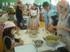 | 取材に行ったときには,すでに茶きんしぼりができあがりかけていました。 目で見ただけでもおいしそうです。 今日は24人の子どもたちが参加しています。 |