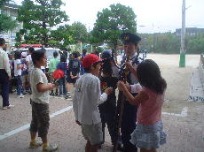 この日は,中立売署から警察官の方に4人来ていただき,お話を聞いたり,いろいろなものを見せていただいたりしました。