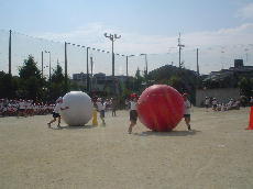 | 1年生の団体競技「大玉おくり」です。練習通りうまく転がすことができたか な。 |