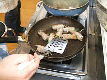 さぁ,調理が始まりました。 学校からも家庭科担当の福井教 諭が参加しています。 |