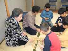 | はねつきです。子どもたちもなかな かの腕前です。おばあちゃんたちも 真剣!! |