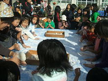 大人がついたあと,子どもたちも もちつきのお手伝いです。 子供用のきねがあります。 |