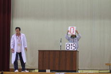 | 吉吉コンビから,全校のみなさんに,大事な報告がありました。 1年間やってきて,解答用紙の応募が少ないので,3月をもって, 長年親しまれてきた吉吉コンビは解散します。 会場からは「エーッ!」というおどろきの声や,「いやだー。」という, 声が聞こえてきました。 その後,第1回目で行われた,あいさつを題材にした劇が再現 されました。 (あらすじ)「最近,あいさつがしっかりできている人が少なくなったなぁ。」 という吉吉コンビからのつぶやきがあり,吉山先生と吉見君で, よいあいさつについて,考えました。 PART1・だまってあいさつをしない人 PART2・小さい声で,下を向いてあいさつをする人 PART3.元気にあいさつをする人 PART4・帽子をとってから,「おはようございます。」と言って,あいさつを する人 何番が一番正しいあいさつだと思いますか?正解は4番です。 京都には,小笠原流という流派があり,必ずあいさつをしてから, おじぎをするという,伝統的な考え方があります。 |