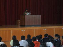 | 自分たちがアイマスクを実際に つけて階段を上り下りした時は, どれだけ支えがあっても歩けないと 思った,と話ました。「辛いことが あっても一生懸命生き,壁を乗り越える ことの大切さや障害を持つ方との関わりに ついて学んだ。」と発表しました。 |