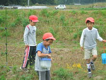 | いもほりを終わった子どもたちは, 虫探しに夢中になっています。 ちゃんと虫かごも持ってきていま すね。 |
