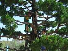 | 校長室前の木は,唯一登ってもい い木になっています。3年生の木登 り名人たちです。 |