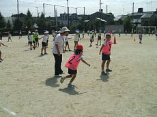 | 中学年は,実際に走る前にグループごとに縦に一列に並んで,バトンパス の練習です。何回もパスを繰り返すうちに,パスをするタイミングをつかんで いきます。 |