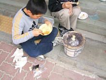 | おもちが焼けたら班のみんなで いただきます。それぞれ家から しょうゆや砂糖,きなこなどを持って きて,おもちに付けて食べました。 |