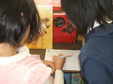 | 学生さんが読んでくれた本の題名を 当てるゲームです。グループに分か れ,登場人物や内容から,題名を考 えていきます。読解の能力が育つ場 面です。 |