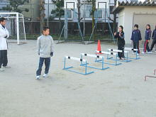 | 手に水の入ったペットボトルを持って腕ふりの練習をします。 | こちらはハードルを使った 練習です。足を高くあげて飛びこえ ます。 |