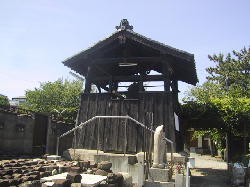 | 報恩寺の山門、門の手前に石橋があります。 | 山門を入ったすぐ左手にある鐘楼。 |