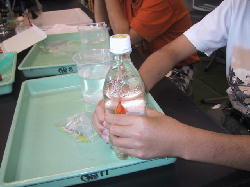 | 実験室では,「浮沈子」のおもちゃ作りをしました。水が入ったペットボトルの中のサカナ (サカナの形のしょうゆ入れ)が,「しずめ!」「うけー!」という命令で浮いたり,沈んだりする とてもおもしろいものです。みんないっしょうけんめいに作りました。 |