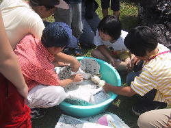 | ザリガニつりをしたり,ひよこやカメさんにさわったりしました。外は大変暑い日になりました。 | |