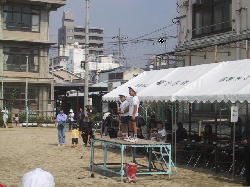 | プログラムは、 @団体競技「めざせ!ワールドカップ」 Aマラソン「はしれ とっとこ ハム太郎」 B障害物走「わくわく どきどき」 Cリレー「それいけ アンパンマン」 Dダンス「ドゥビ・ドゥビ ベイビーボーイで踊りましょう」 など楽しい種目がありました。 これは、「めざせ!ワールドカップ」 京極校のお友達と手をつないで、ボールをけってゴールのあなにボールをいれます。 うまくボールがはいると、審判の先生の旗があがります。 |