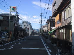 | 今出川通室町の交差点を南側から北方面の望んだところ。北の方に伸びている道路は室町とおりです。正面に見える理容店の角に、小さな石碑が立っています。 | この石碑には、「従是東北 足利将軍室町第趾」と刻まれています。この地点より東北は室町幕府・足利将軍の邸宅跡であるという意味です。室町幕府の敷地は、東西を、烏丸通と室町通、南北を今出川通と上立売通の囲まれた長方形の敷地です。現在では、この周辺の町名に当時のなごりが残されています。 | 石碑の立っている所から、室町通の北の方を望んでいます。この通りの右側(東側)が 室町幕府の跡地になります。この地点から、約300mほど北に行った右側に、室町小学校の正門が室町通に面してあります。 |