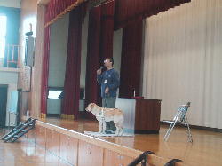 | 盲導犬に出会った時に,どんなふうにしたらいいの? 1.ハーネスをつけている時は,仕事中です。仕事のじゃまをしてはいけません。 2.仕事中の盲導犬には,食べ物を与えたり,さわったりしないでください。 3.ハーネスには触らないでください。 4.あたたかく見守ってください。 そして,「何かお手伝いできることがありますか?」と声をかけてあげることも大切 です。 子ども達は,1時間ほどのお話を真剣な表情で聞きました。盲導犬のことについて, そして,目の不自由な方へ私たちができることについて多くのことを学びました。 |
