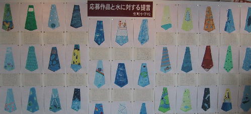| 室町校からは,出品校の中では最も多い135点の作品が出品されました。 今回のテーマは,来年2003年3月に京都を中心会場として開催される「第3回世界 水フォーラム」を記念して,「水にちなんだネクタイ・デザイン」です。 ネクタイのデザインとともに,水にたいする提言の作文が展示されています。 |