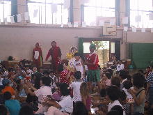 | 「満員とびばこ」「アンパンマンみーつけた」「ねらってポイ!」「かんじて パァ!」「はかって,ポン!」「まんてん5もじ」「ハイなんぼ?」「ドキドキびっ くりボン」など楽しいコーナーです。体育館では,「歌・あそびコンサート」が 午前と午後2回ありました。 |