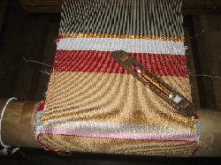| これは,この1週間ほどの間に,中間休みや昼休みの時間に織り上げたもので す。横糸も色を変えながら織っています。2年生の子ども達が織ったとは思えない ほど上手な出来栄えです。 |