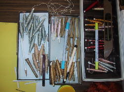 | 杼にもいろいろな種類や形・大きさがあります。よく見ると杼のなかに「くだ」に巻かれた横糸が さしてあります。右の杼には2つのくだがいれてあり、糸の色も違います。このように同時に ちがった色の横糸を通すことによって、複雑な感じの色の織物が織れます。 |