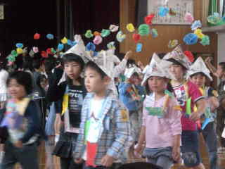 1年生を迎える会を行いました。6年生が作った折り紙のかぶとを頭にかぶった1年生が,6年生に手を引かれて入場。盛大な拍手に包まれながら,アーチをくぐり壇上へ。 その後,さくら学級を皮切りに,2年生から6年生までの出し物,そして全校合唱,プレゼント渡しを行いました。全校が温かくてやさしい気持ちにひたれたひとときでした。
