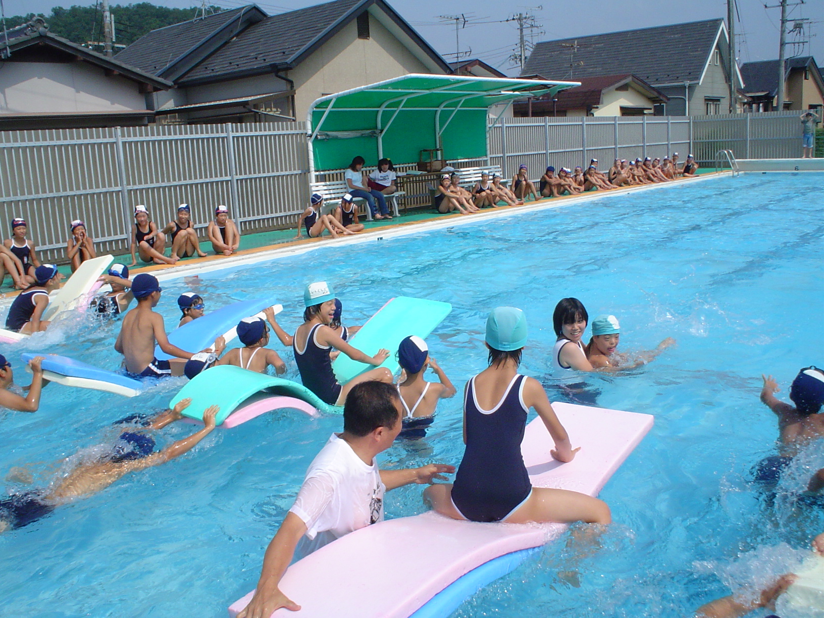 | 水泳学習最後の日には、ひまわり学級のお友達も一緒に、クラス対抗のゲームをしました。 宝さがし、ビーチバレー、ロングビート板渡り・・・。 思わず、担任も熱くなって応援してしまいました。 各クラス、一致団結していました!! |