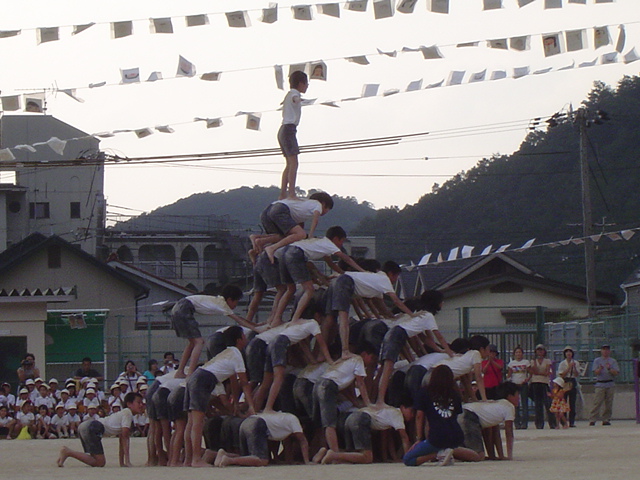 途中で、崩れかけたけど、そこは、みんなの気合いで、なんとか持ちこたえ、見事7段ピラミッドが完成しました。
