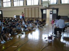 | 地域の「年輪クラブ」の落合さんから、地域のお年寄りの生活や願いについてお話をうかがいました。 その中で、子ども達は、スカイクロスというスポーツに興味を持ったようで、「いっしょにやってみたい」という声がたくさん聞かれました。 最後に落合さんは、子どもたちに「みんながすぐにできることで、お年寄りにとってうれしいことはなんだと思いますか?」と尋ねられました。子どもたちは、いろいろかんがえましたが、残念ながら正解者はいませんでした。答えは、「あいさつ」です。 「これからお年寄りに道で会ったら、しっかりとあいさつをしたいと思います」と、たくさん感想に書いていました。 |
