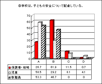 | ・児童の安全は100%でなければならない。しかし,不安に思っている保護者は多い。教職員と保護者,地域とが協力して,より安全・安心できる体制を考えていきたい。 |