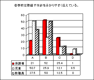 ・保護者のCを見ると,最も高い。前回と比較しても増えている。保護者との密なる連携及び学級・学年だよりの発行,さらには学校だよりの早期配布を心がけたい。また,保護者には学校開放日の活用を広げたい。 |