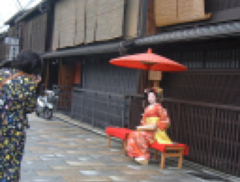 ここは、お茶屋さんがたくさんあるところです。辰巳大明神「たつみだいみょうじん」が、前にあって、白川が横にあってきれいです。まいこさんが、座っているのは、休けい場です。床机「しょうぎ」です。つまりベンチです。
