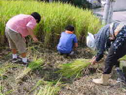 | 稲刈り体験活動 秋、天気のよい日でした。 よく実っていたのでうれしかったです。 早速稲刈りをしました。 ここでもうまく鎌をつかって刈ることができました。このときに収穫したお米を家庭科の野菜の調理の実習で食べました。 とてもおいしかったです。 僕はお代わりをたくさんしました。 |