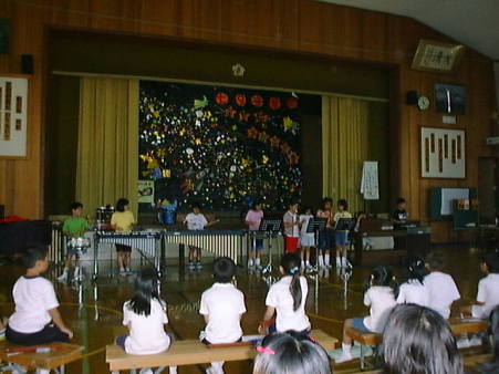 | 七夕音楽会をして これは七夕音楽会の時の写真です。 演奏した曲は風の丘ともののけ姫ととなりのトトロをえんそうしました。 となりのトトロは、とてもむずかしくて練習の時はみんなとぜんぜんあわなくてとてもピンチでした。本番は少し失敗したけどあとの2曲はかんぺきだったのよかったです。 |