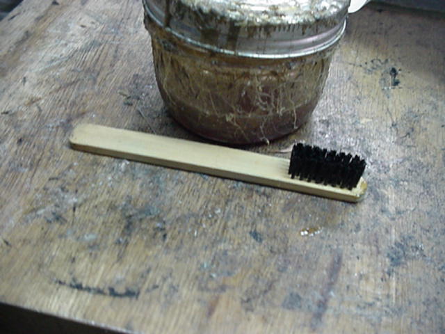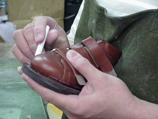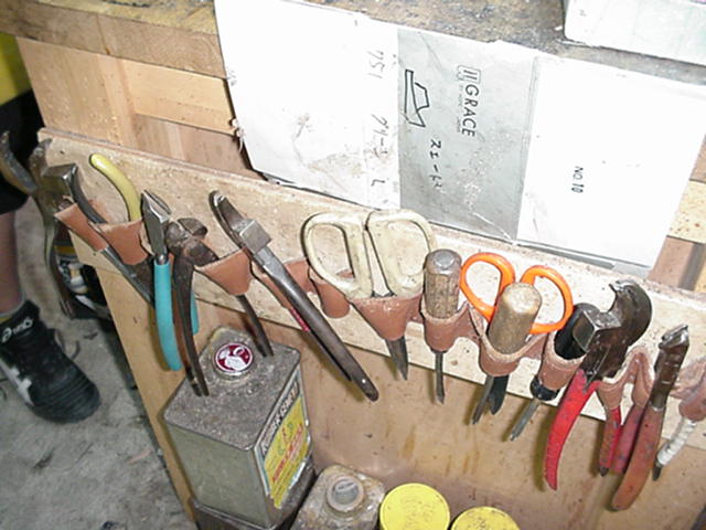 くつをしゅう理するために道具がいっぱいあります。はさみやドライバーやぬののせんようのボンドがあります。そのボンドをぬるブラシのようなものをつかっています。